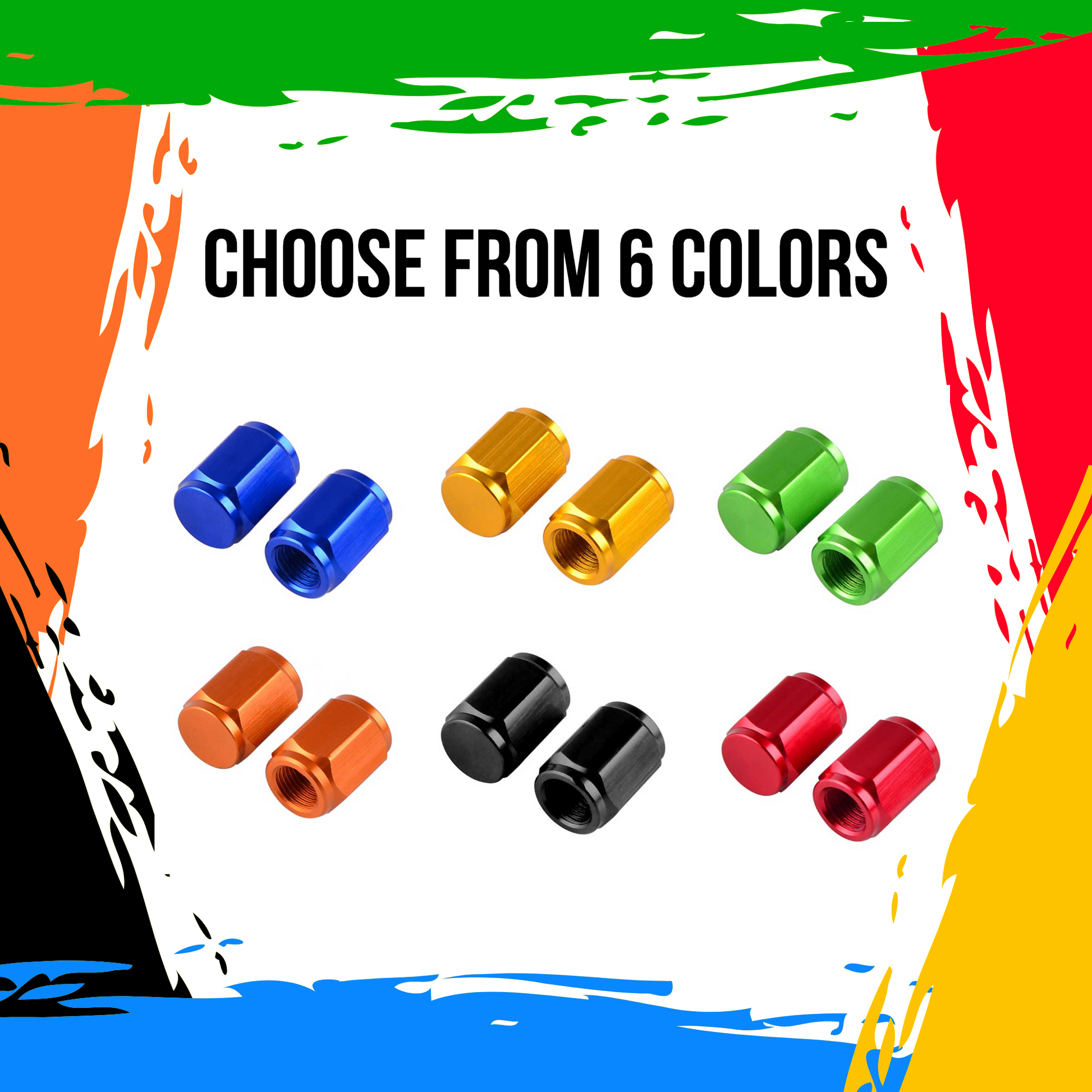 Built to last, they resist fading, corrosion, and road grime far better than plastic. Each set includes two caps in your choice of black, blue, gold, green, orange, purple, red, or silver.