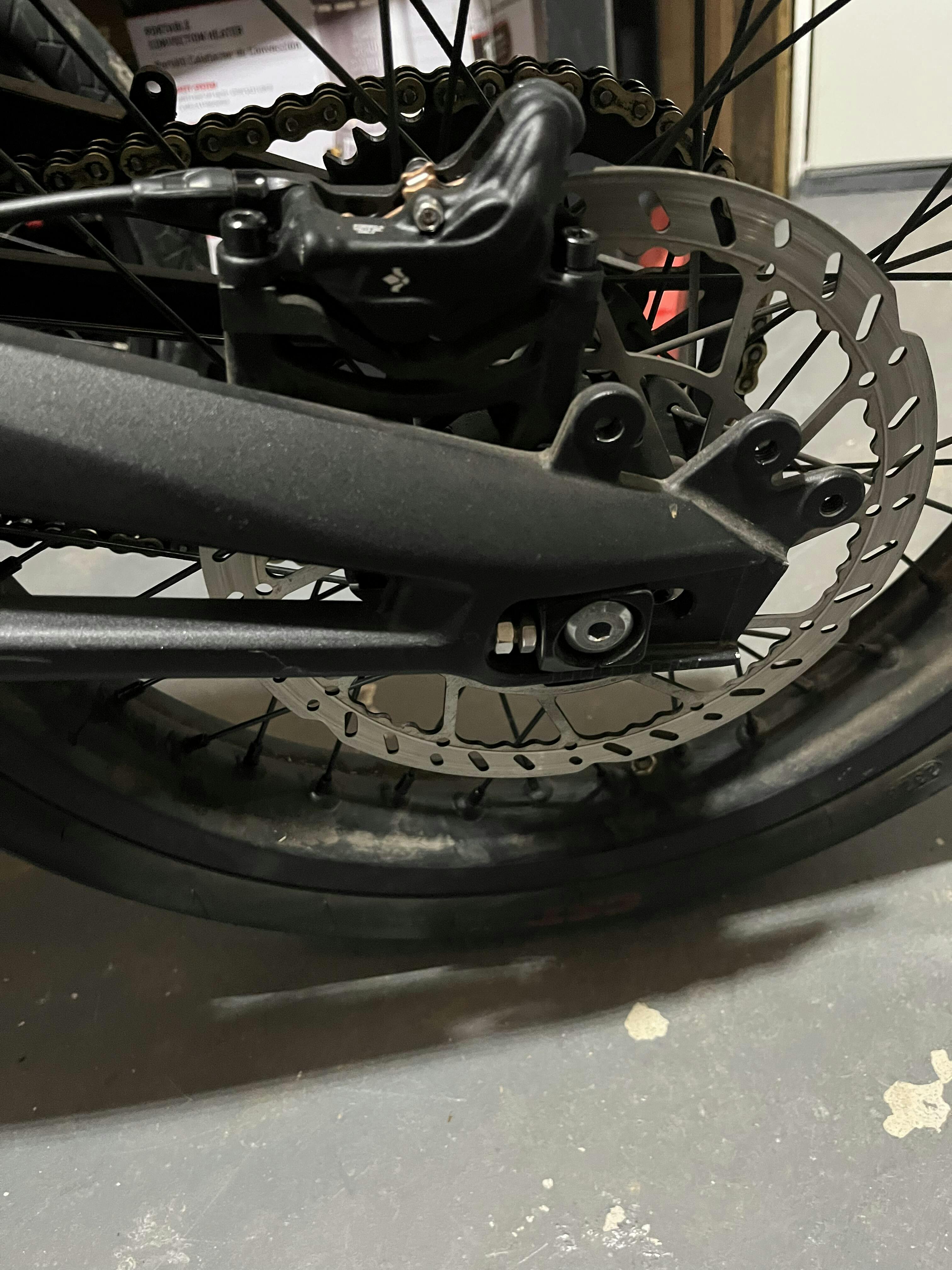 The eMoto brake fits the stock forks on all Surron LightBee, Talaria Sting and E-Ride Pro models via a PM6 Mount.