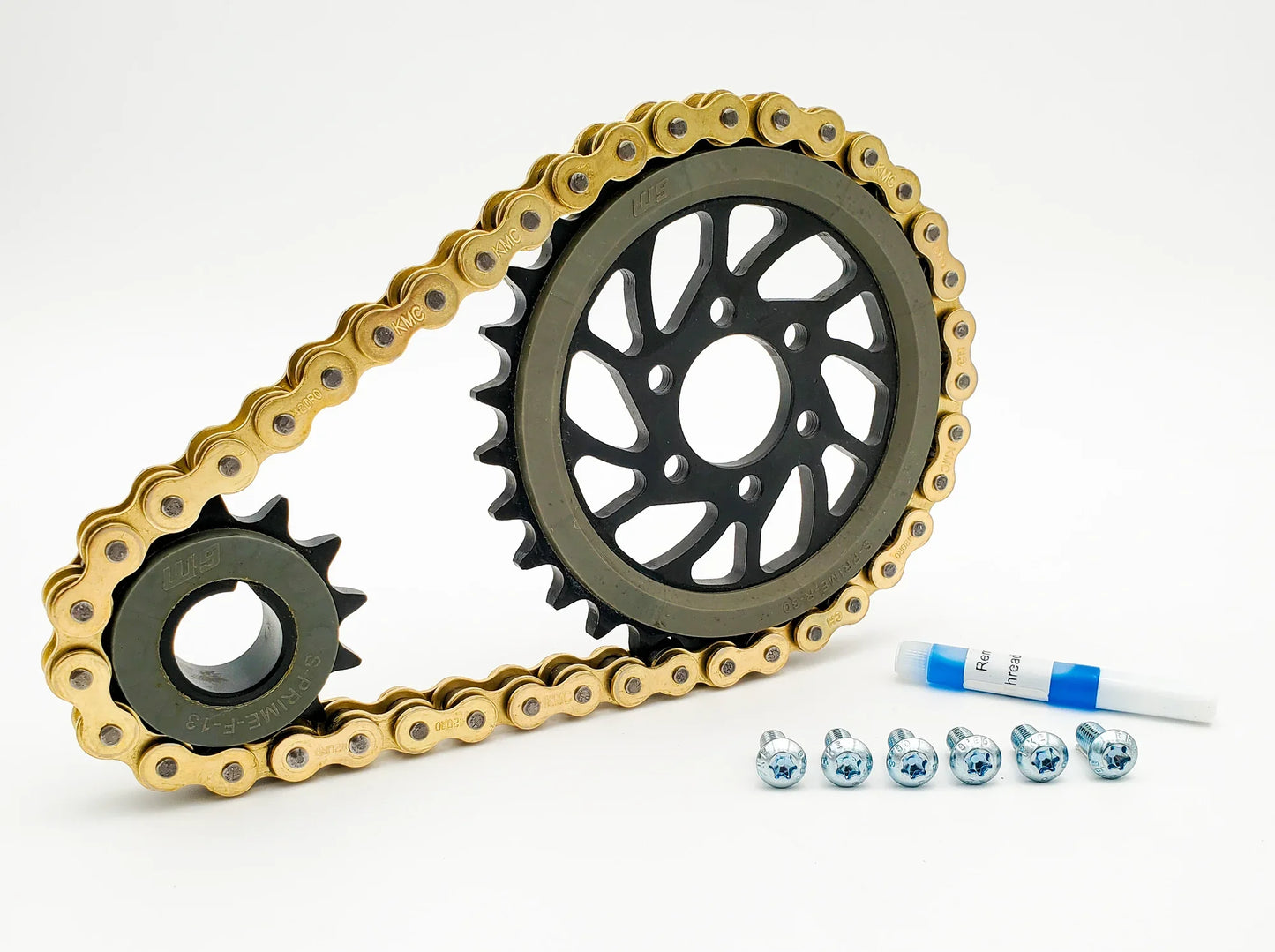 - Includes 2 dampened sprockets in EDM coated black steel